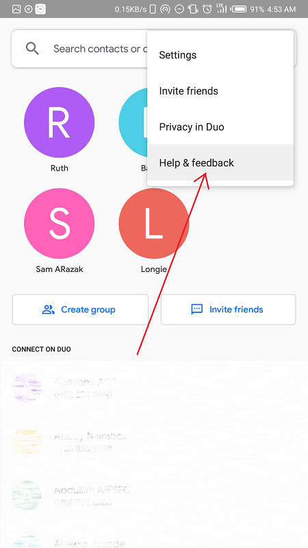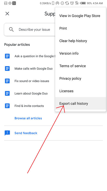 - On Android: Tap on “Help and feedback”, click on the three dots at the top right corner again and select “Export call history”.
