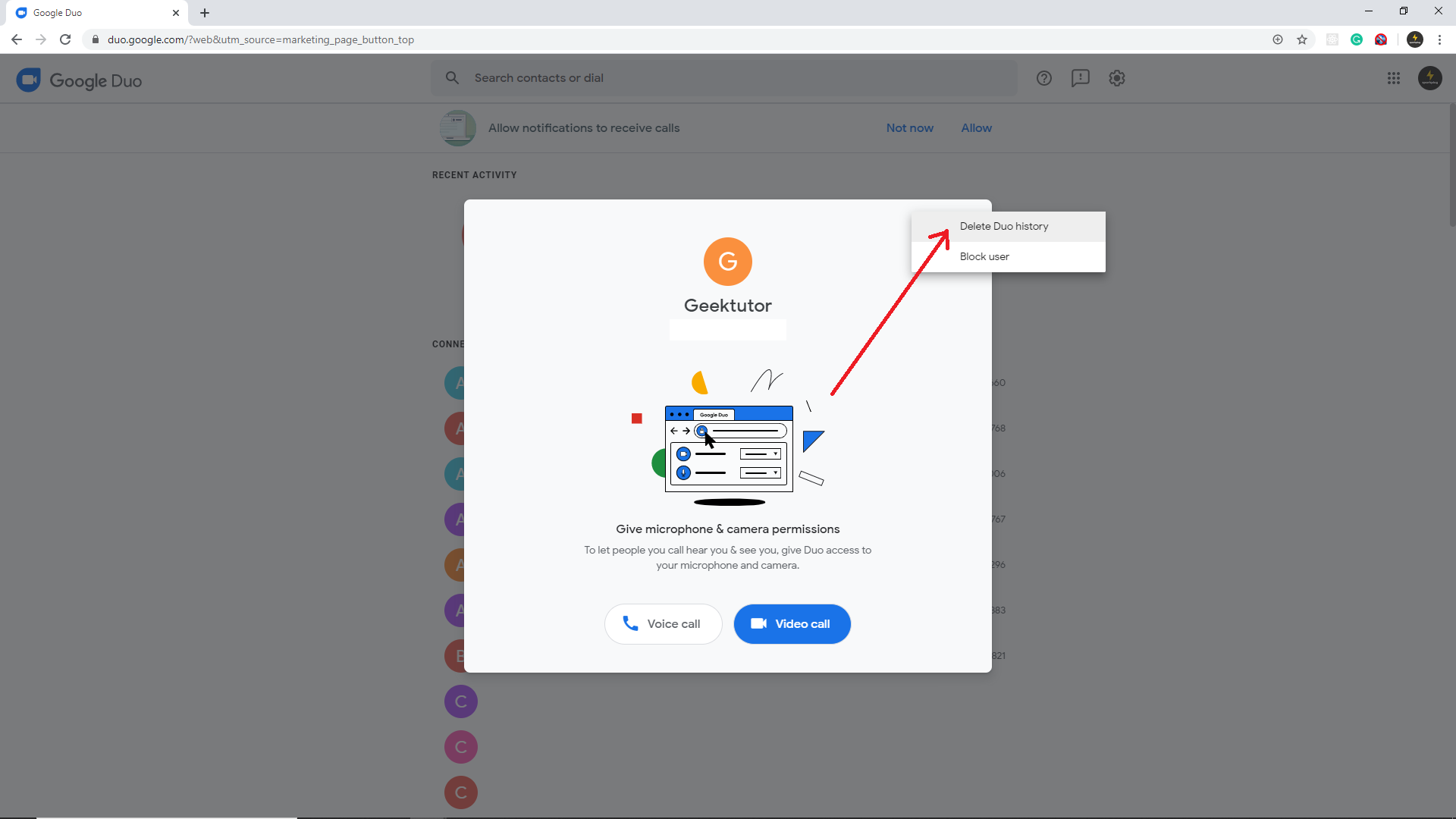 If you use Duo on your web browser, all you need to do is to navigate to the contact whose history you’re interested in deleting, click on the three dots at the top right corner of the contact’s card, and select “Delete Duo history”.