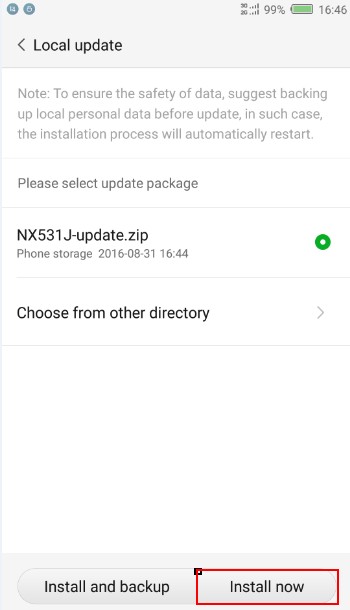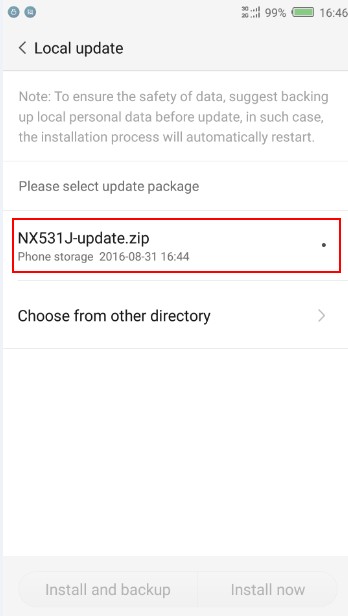6. The phone will automatically detect the stock ROM zip file you placed in the root directory in step 3 above. Choose it and click Install now.ZTE Nubia Reboot Screen